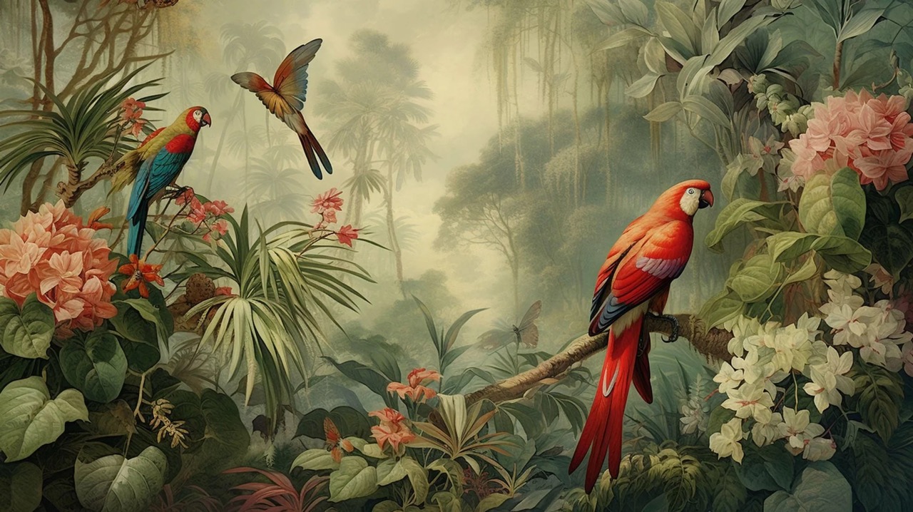 colourful parrots perched amidst lush greenery with a cascading waterfall in the background. It’s a vibrant and enchanting scene perfect for adding a touch of nature to any room.