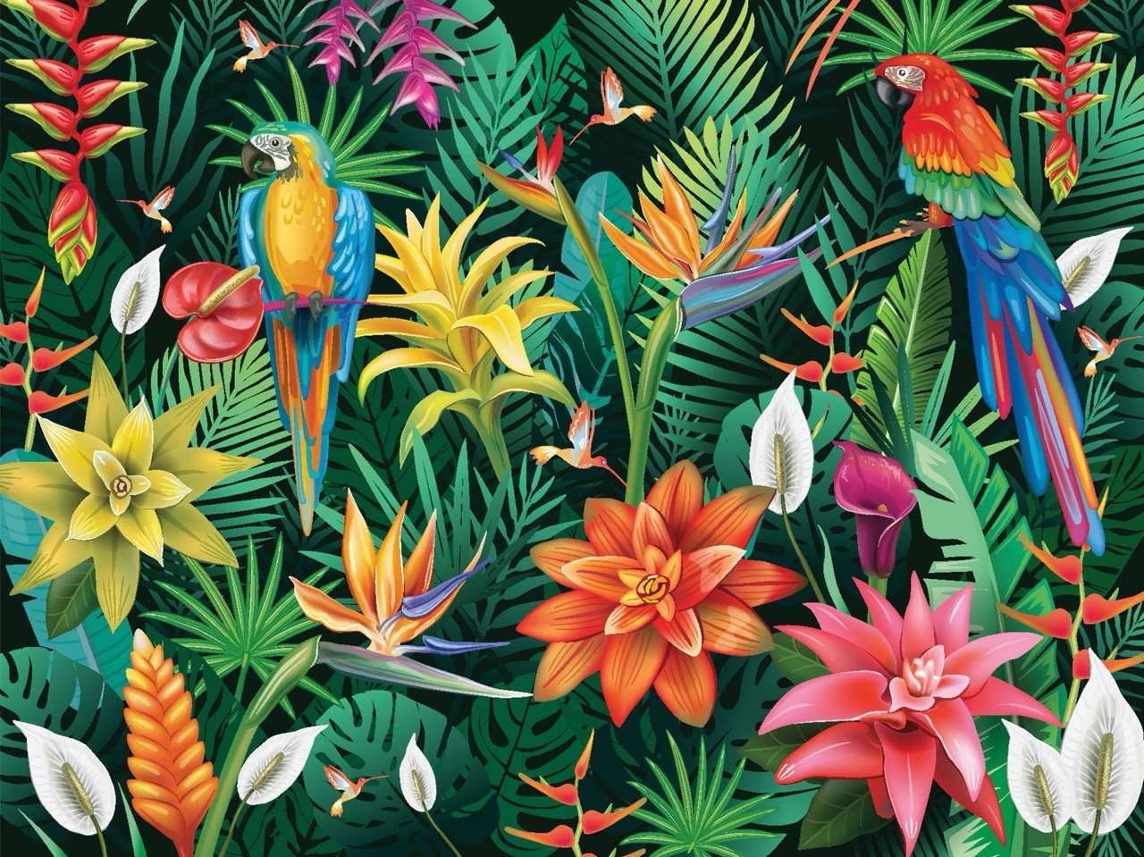 Beautiful bright jungle flowers and parrots Transform your walls into a tropical paradise with this vibrant mural. Let these bold colours and playful birds bring a smile to your face every day.