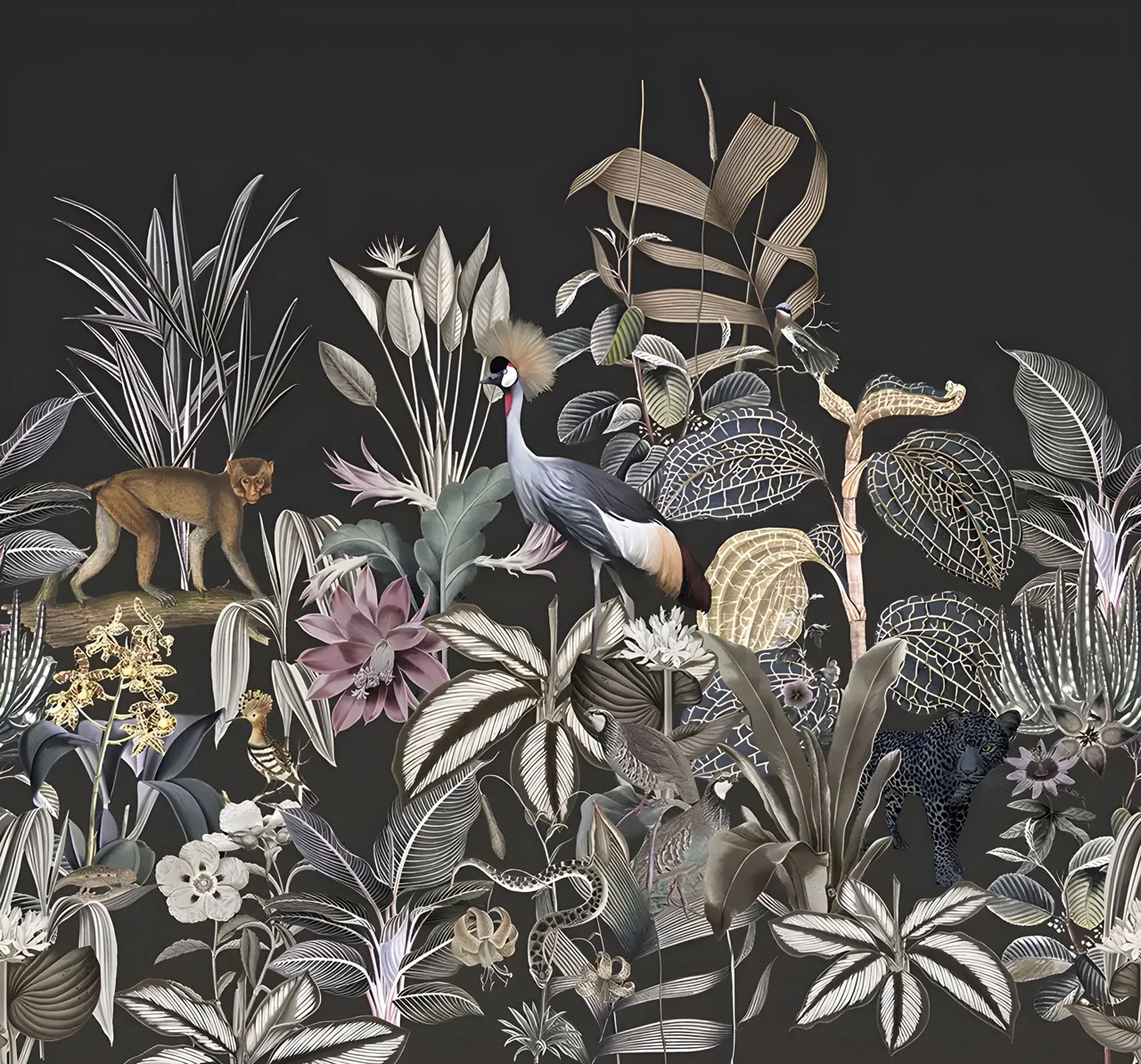 wild jungle animals on black background A majestic scene of animals and plants, all bursting with color atop a sleek black backdrop. Get lost in the captivating beauty of nature without ever leaving your walls.